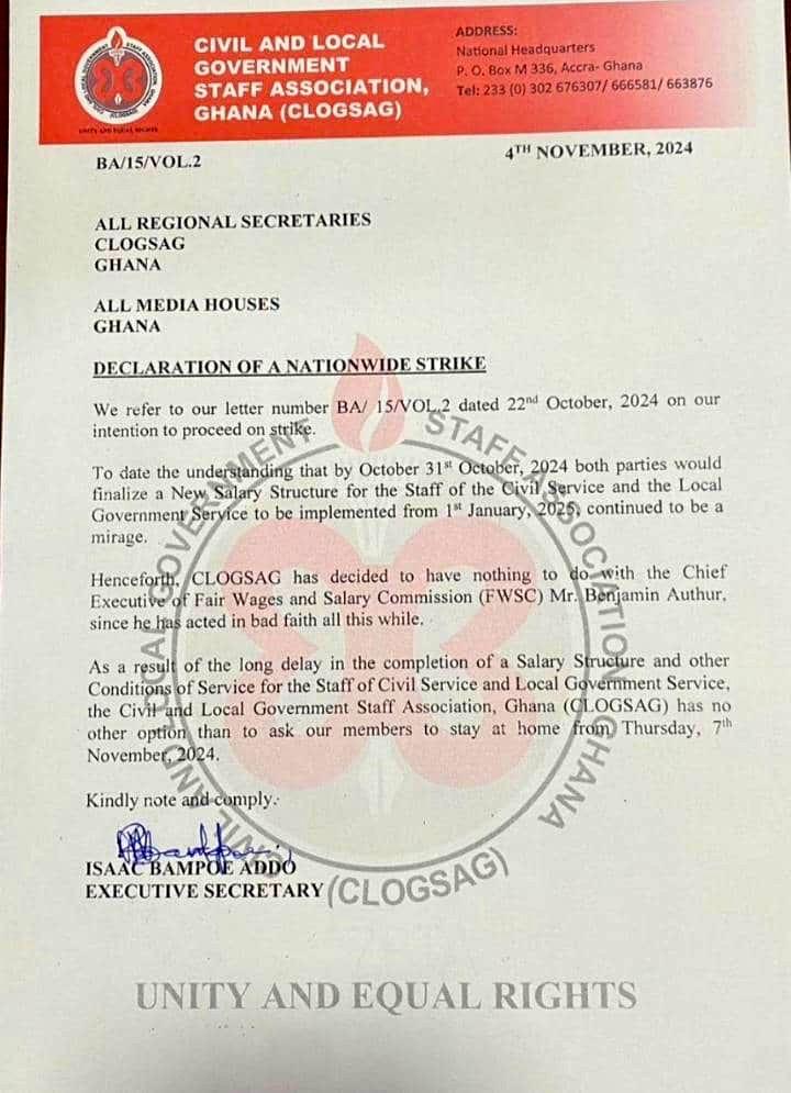 “As a result of the long delay in the completion of a New Salary Structure and other Conditions of Service for the Staff of Civil Service and Local Government Service, the Civil and Local Government Staff Association, Ghana (CLOGSAG) has no than to ask our members to stay at home on Thursday, November 7th”.