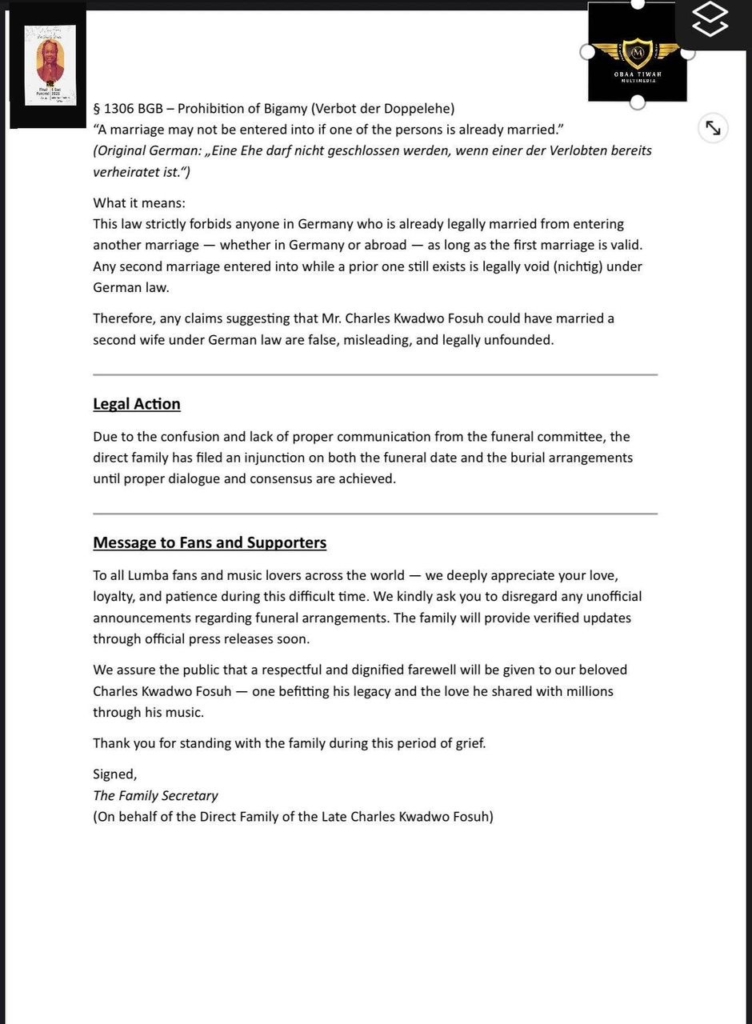 They reminded the public that the late musician was legally married to Mrs. Akosua Serwah Fosuh on 23rd December 2004 in Bornheim, Germany, and that under German law, bigamy is strictly prohibited. Citing Section 1306 of the German Civil Code (Bürgerliches Gesetzbuch), the family said: “A marriage may not be entered into if one of the persons is already married,” stressing that any second marriage under such circumstances is “legally void.”