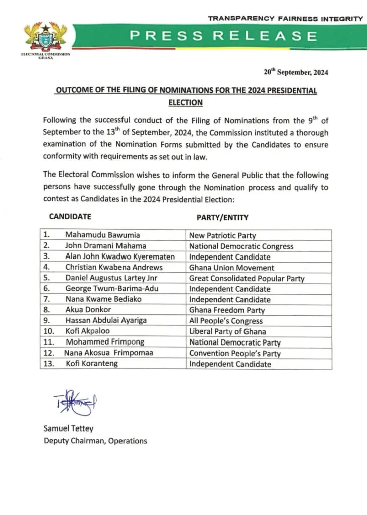 Deputy Chairman of Operations of the EC, Samuel Tettey, made this disclosure during an update on the status of candidates following the submission of their respective forms which took place from September 9 to September 13, 2024.