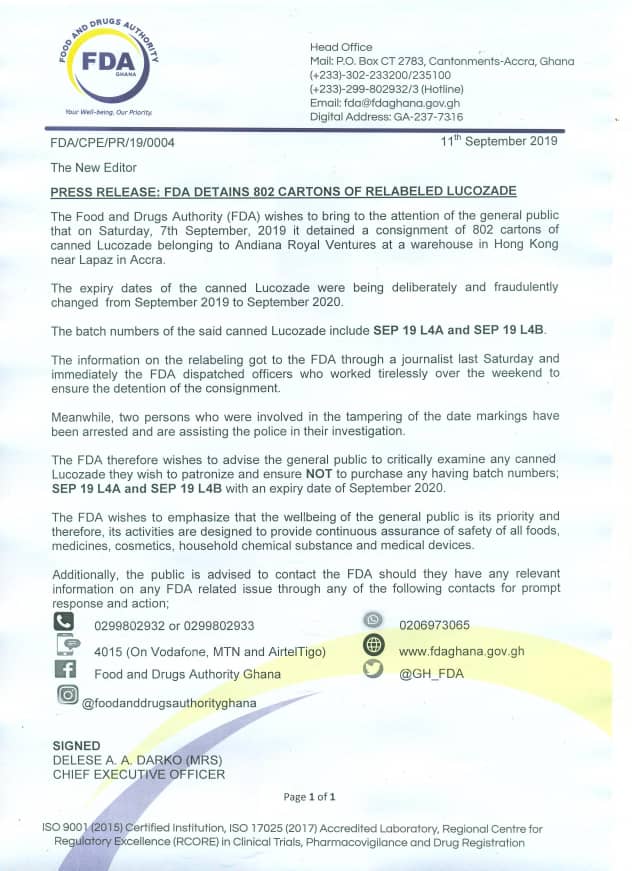 The Food and Drugs Authority has announced that it has detained some 802 cartons of canned Lucozade over attempts by the importer to change the label of expiry dates from September 2019 to September 2020.