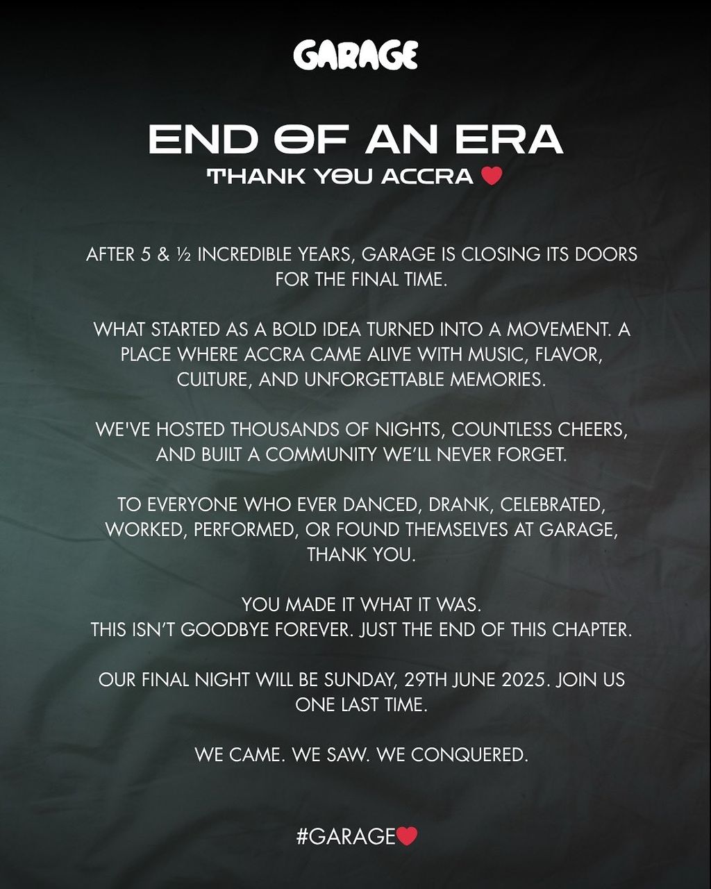 The final night at Garage is set for Sunday, June 29, 2025, with management inviting patrons to join them for one last celebration. “We came. We saw. We conquered,” the post concludes.