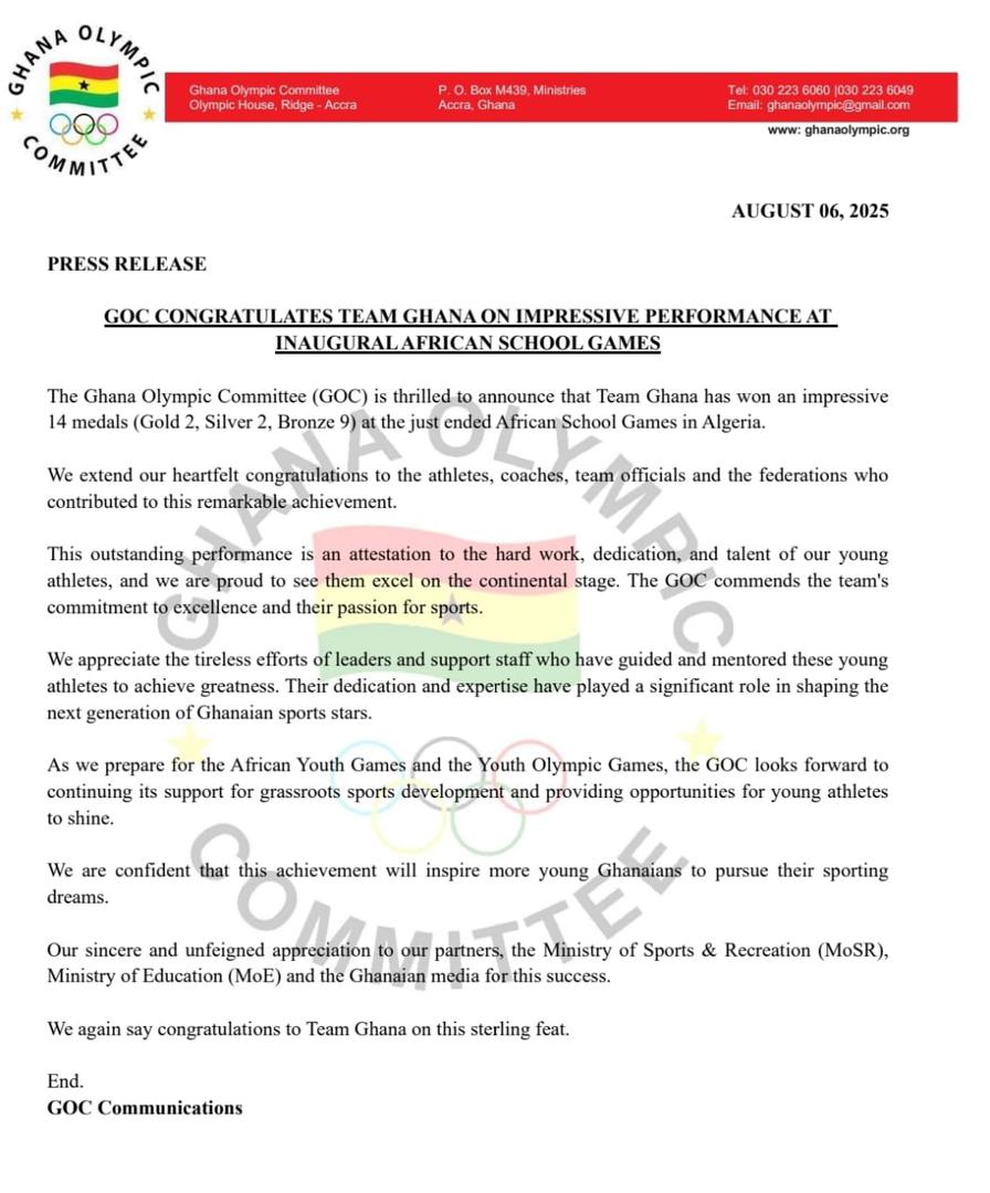 The Ghana Olympic Committee (GOC) has commended Team Ghana for their outstanding performance at the just-ended Inaugural African School Games held in Algeria.