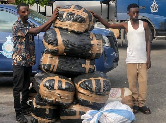 Two persons in possession of eleven large compressed sacks of a substance suspected to be narcotics at Ayi Mensah in Greater Accra were arrested on June 7, 2025, by the police.