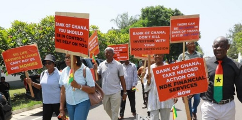 The protest started near the NDK Finance office close to the Accra Sports Stadium but had to halt at the Kwame Nkrumah Mausoleum due to the central bank’s premises being a security zone.