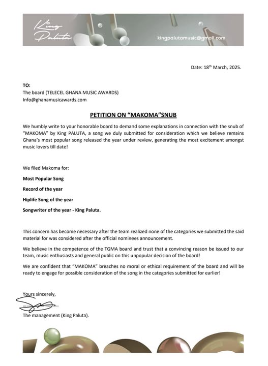 “We humbly write to your honorable board to demand some explanations in connection with the snub of “MAKOMA” by King PALUTA, a song we duly submitted for consideration which we believe remains Ghana’s most popular song released the year under review, generating the most excitement amongst music lovers till date,” the letter said.