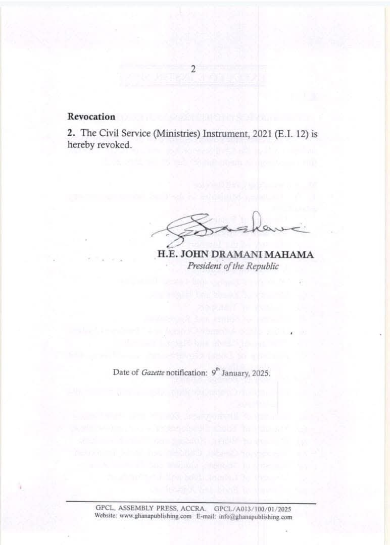The restructuring was formalised through the Civil Service (Ministries) Instrument, 2025 (E.I. 1), signed by President Mahama on January 9, 2025.