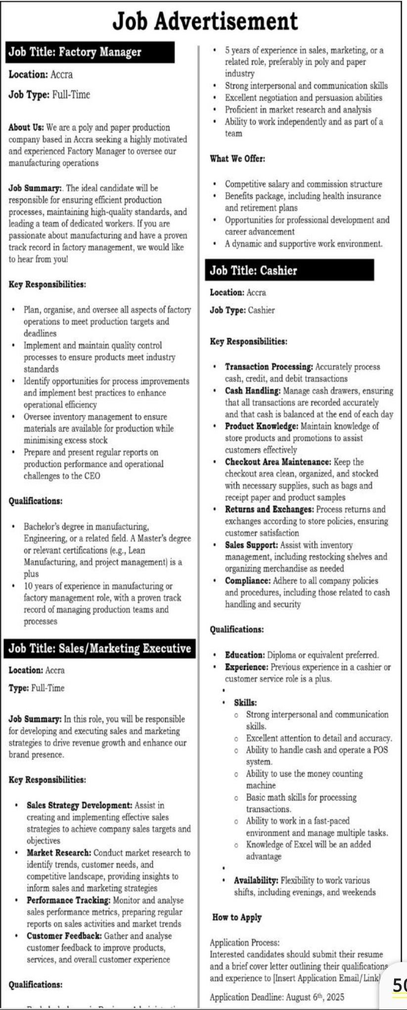 Prospective job seekers can find below the advertised jobs in the July 28, 2025, edition of the Daily Graphic as published in the paper today.