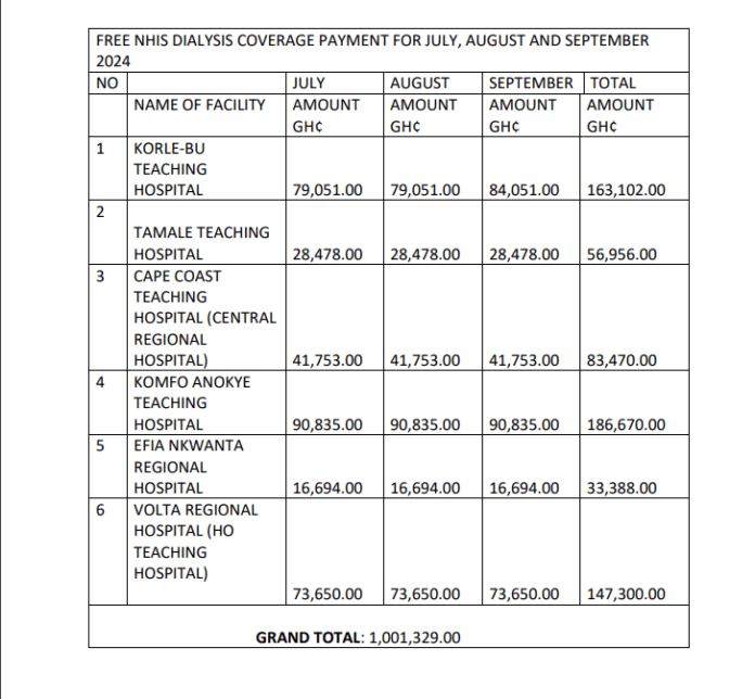 The National Health Insurance Authority (NHIA) has made payment of an additional GH¢1,001,329.00 under the government’s free dialysis coverage.