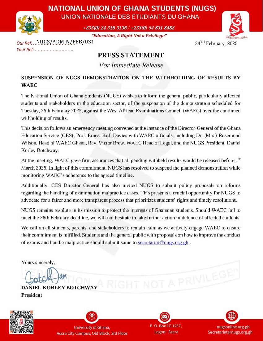 “Following an emergency meeting with WAEC officials and the Director-General of the Ghana Education Service, NUGS has suspended the planned demonstration scheduled for February 25, 2025. WAEC has given firm assurances that all pending withheld results will be released by March 1, 2025,” the statement read.