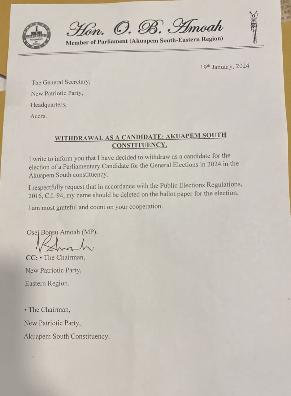 In his letter, O.B. Amoah stated, “I write to inform you that I have decided to withdraw as a candidate for the election of a Parliamentary Candidate for the General Elections in 2024 in the Akuapem South constituency. I respectfully request that under the Public Elections Regulations, 2016, C.I. 94, my name should be deleted from the ballot paper for the election. I am most grateful and count on your cooperation.”