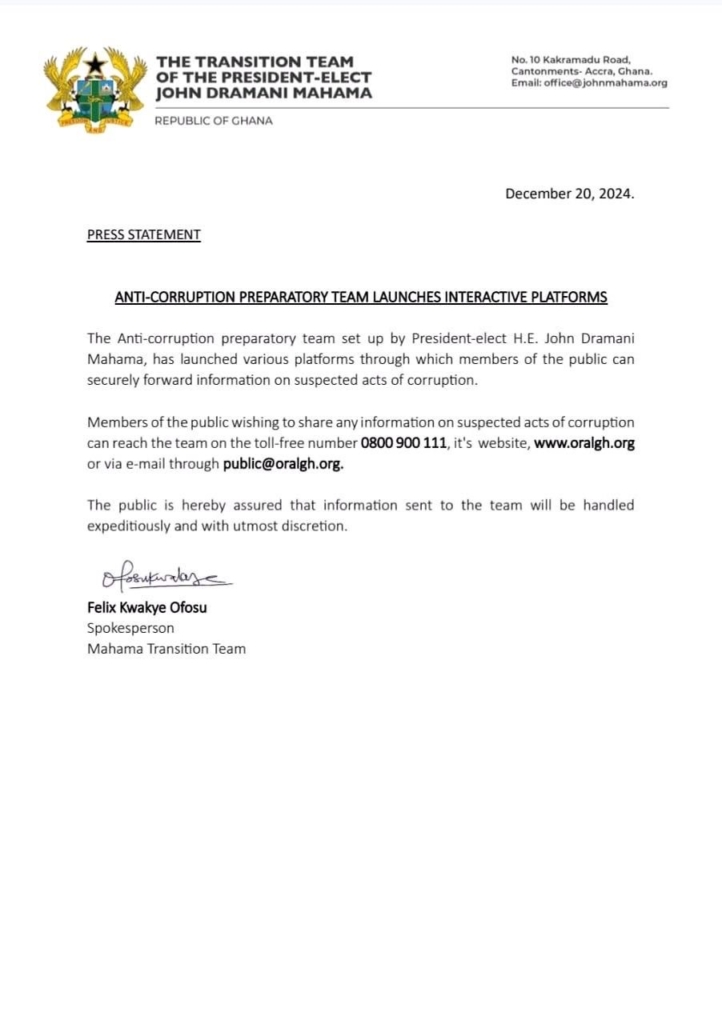 President-elect John Dramani Mahama’s anti-corruption preparatory team has rolled out a series of interactive platforms designed to facilitate public reporting of suspected acts of corruption.