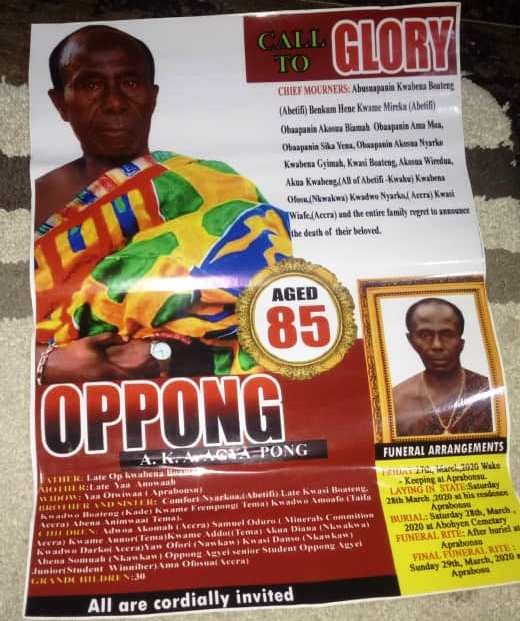 Agya Oppong passed away in February in Nkwakaw at age 85 after a recurring illness.