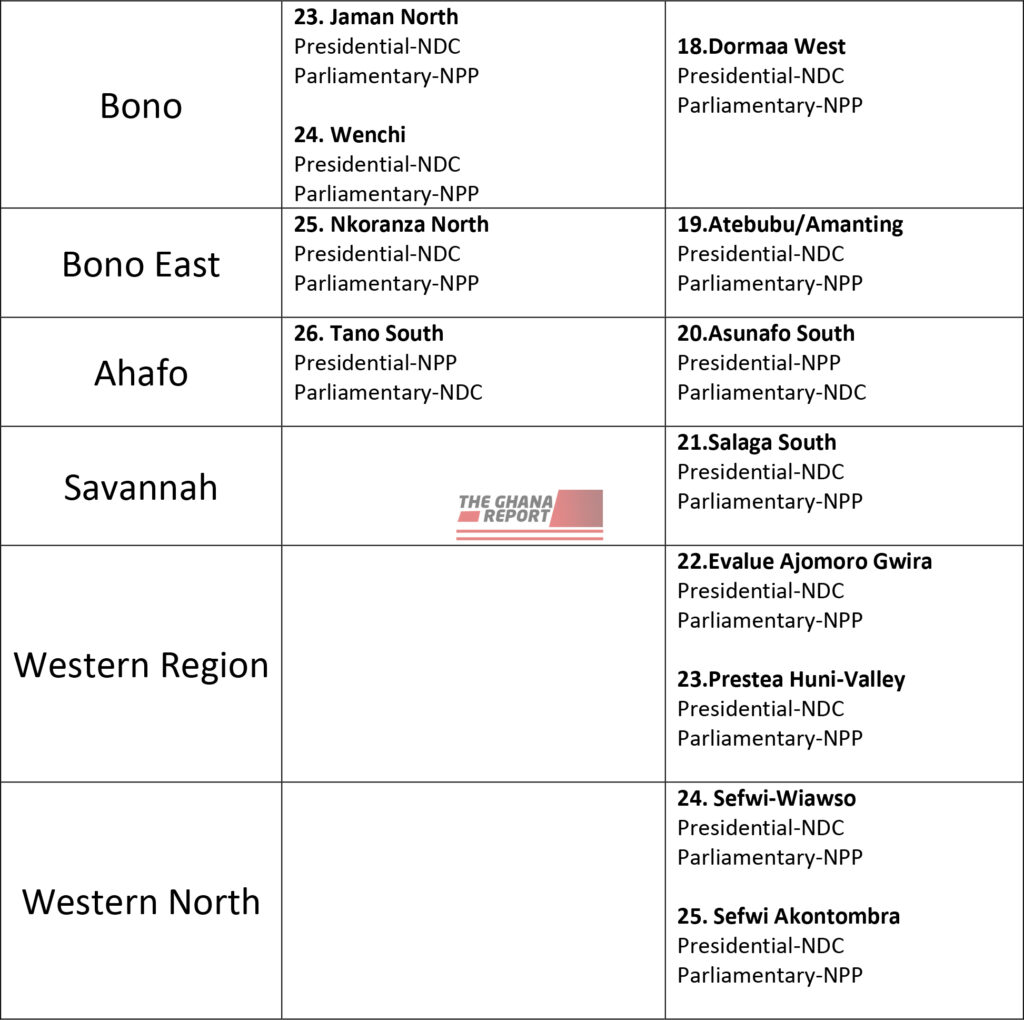 Notable constituencies that are NPP strongholds but voted for the National Democratic Congress (NDC) presidential candidate in 2012 and chose the NPP parliamentarians include Ayawaso West Wuogon and Tema East in the Greater Accra Region; Nkoranza North (Bono East) and Wenchi, the home constituency of Dr Kofi A. Busia—a stalwart of the NPP—in the Bono Region and Offinso North in the Ashanti Region.